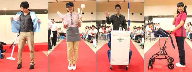 出演モデルが着こなしたウエアは、ファッション性はもちろん、機能性、実用性、作業効率も兼ね備えており、さらに清掃道具メーカーの商品も同時にご紹介。
